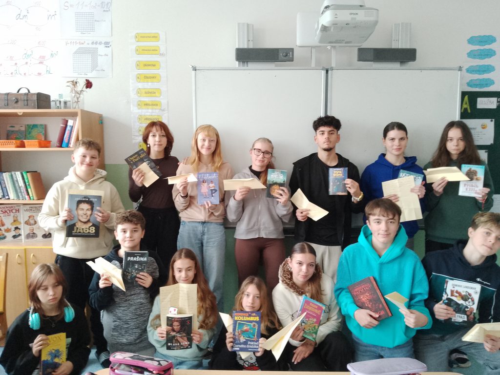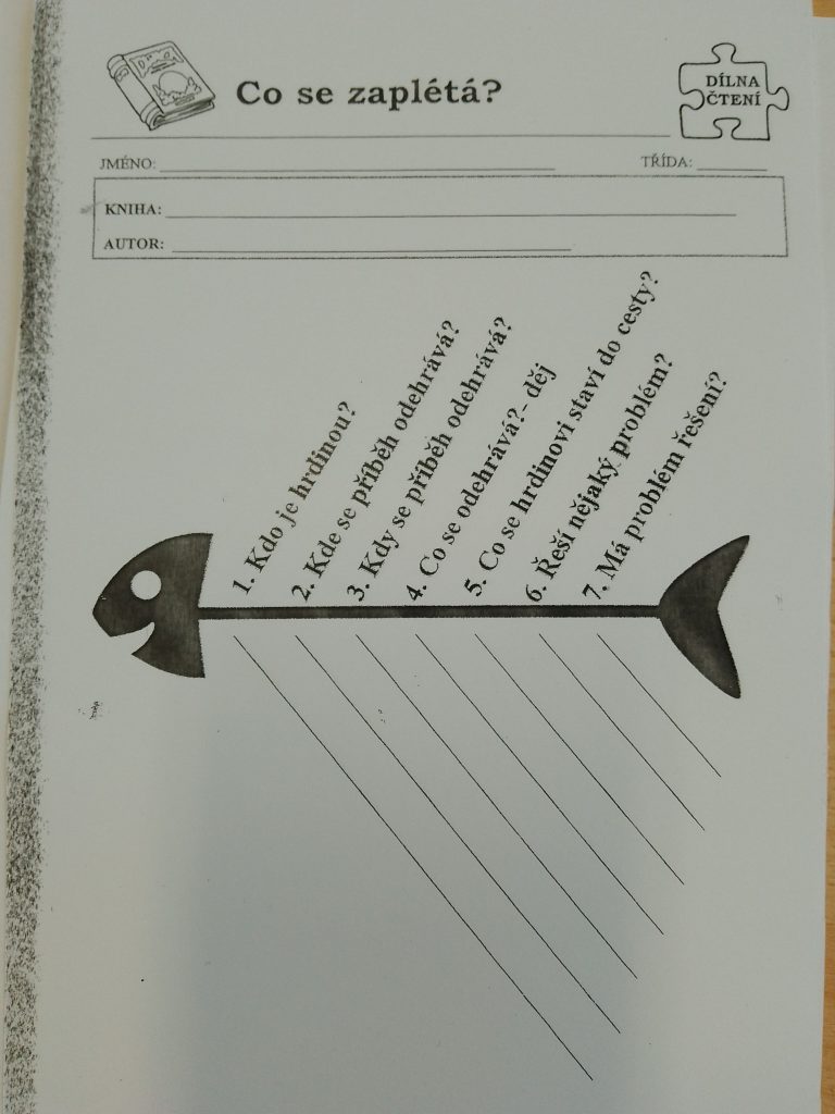 Následovala práce s pracovním listem, tzv. rybí kost. Cílem bylo knihu představit - kdo jsou hlavní hrdinové, kde a kdy se příběh odehrává a zda postavy řeší nějaký problém. Ten žáci napsali na list papíru, ze kterého složili vlaštovku a tu pak nechali letět na chodbě. Každý si vybral jednu vlaštovku, měl poradit, jak problém vyřešit a vložit do správné knihy. Majitelé knih si pak mohli přečíst rady od svých spolužáků.