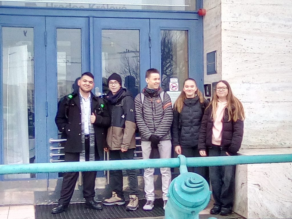 Protože jsme se v letošním školním roce zapojili do dějepisného projektu organizovaného neziskovou organizací Post Bellum s názvem Příběhy našich sousedů, vypravili jsme se ve středu 14. ledna 2026 do Hradce Králové. S sebou jsme si nezapomněli vzít scénář k nahrávce o našem pamětníkovi, ten jsme už ale mnozí znali doslova zpaměti. Na místo jsme dorazili s téměř půlhodinovým předstihem, a proto jsme byli velmi překvapeni, že nás pracovník rozhlasu, který měl naši nahrávku na starost, již očekával a osobně přivítal před hlavními dveřmi. Když jsme po chvíli vstoupili, museli jsme se ještě vyfotografovat u poblíž stojícího modelu Eiffelovy věže z Merkuru, seznámili jsme se i s roztomilým štěnětem kokršpaněla, patřícího panu Peterkovi, Kiliánem. Pak už jsme neztráceli čas a v prvním patře rozhlasu jsme usedli do židliček před textilem polepenou nábytkovou sestavou ukrývající mikrofon. Nejprve jsme byli obeznámeni s procesem nahrávání, se správnou výslovností, s programy, které nám umožní nahrávat i doma. Byly nám přiblíženy nástrahy akustiky. Pak už jsme jeden po druhém usedali před mikrofon a četli svůj text. Někomu se to povedlo hned napoprvé, jiní se pokoušeli vícekrát. Nikdo ale nebyl vítězem. Neúprosný mikrofon odhalil každou chybu v tempu i výslovnosti. Poté už jsme jen obdivovali, jak pan Peterka nahrávku stříhá, na některých místech zrychluje nebo naopak mírně zpomaluje, čistí od opakujících se slov či nepatřičných zvuků. Celý výsledek na závěr doplnila znělka a působivá hudba. Přestože jsme se obávali, odjížděli jsme spokojeni s výsledkem naší několikaměsíční práce.