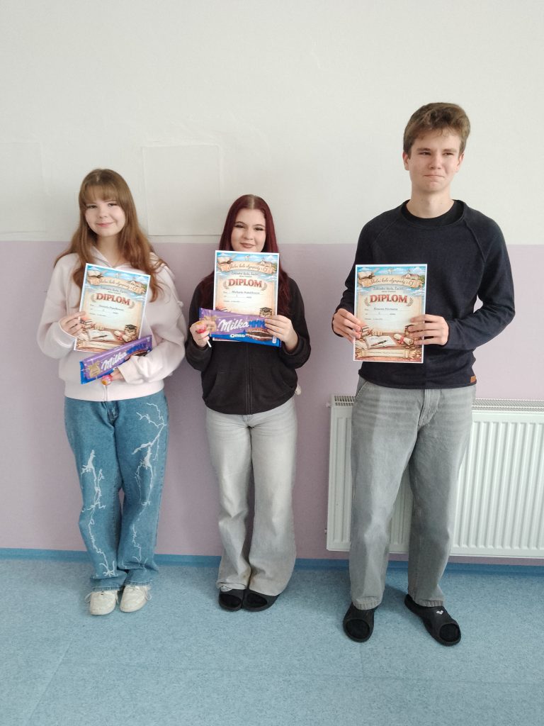 Na 1. místě se umístila MÍŠA HUBÁČKOVÁ z 9. A, 2. místo patří DANČE POPELKOVÉ z 9. A a 3. místo obsadil ŠIMON HERMAN z 9. B.